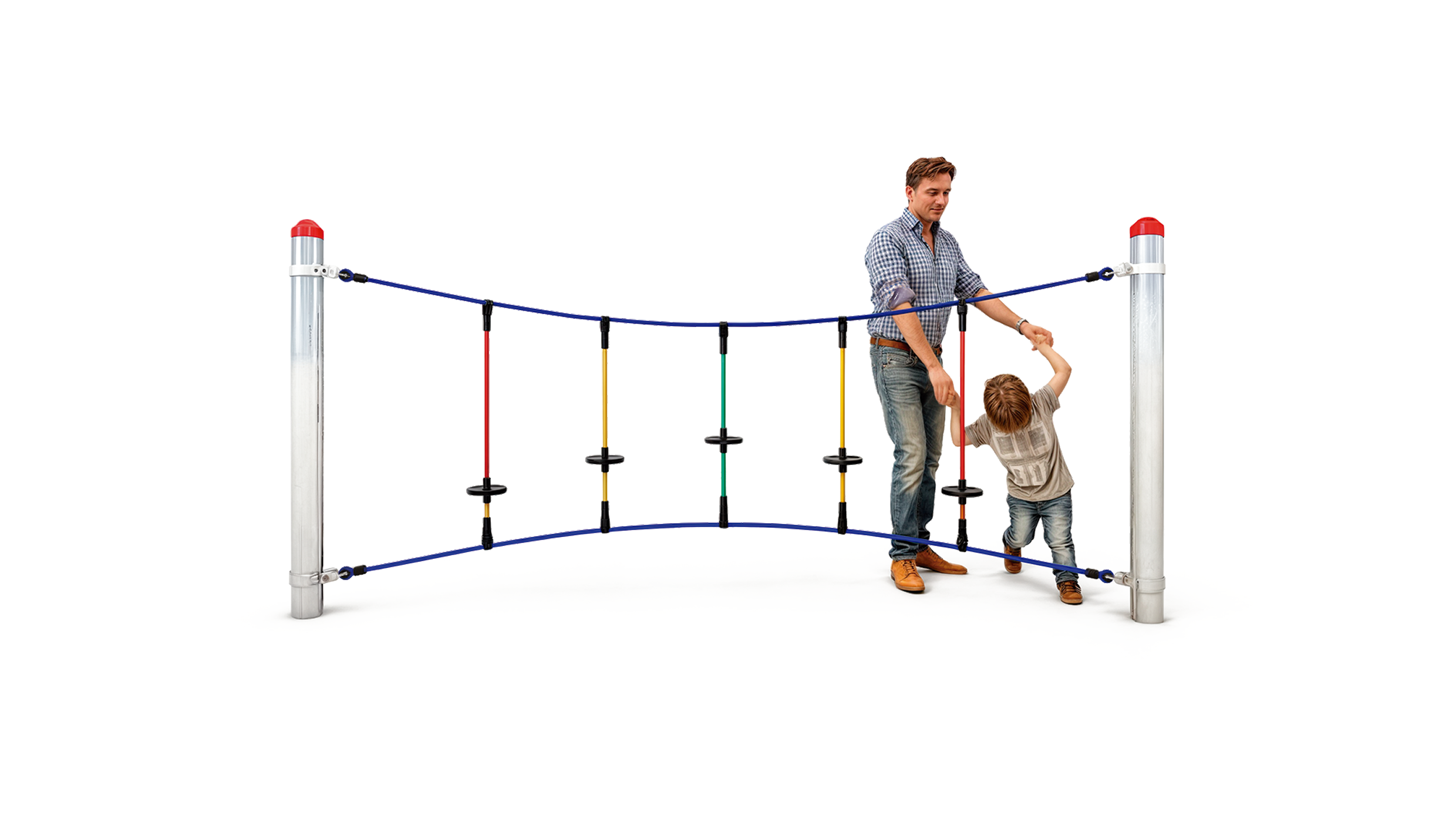 Variantenreich, einfach zu installieren, wartungsfreundlich und für Kinder von 2-14 Jahren geeignet. Kreieren Sie sich Ihre eigene Spielanlage nach Ihrem individuellen Platzangebot. Je nach Alter und Anspruch können Sie zwischen verschiedenen Pfostenhöhen, Gummimatten, Hangelseilen, Wackelbalken, Kletternetzen und vielem mehr wählen. Jeder Parcours wird so zum Unikat und ist an Ihre örtlichen Gegebenheiten angepasst. Die Integration von barrierefreien Elementen sorgt dafür, dass Kinder aller Fähigkeiten gemeinsam spielen und lernen können.
