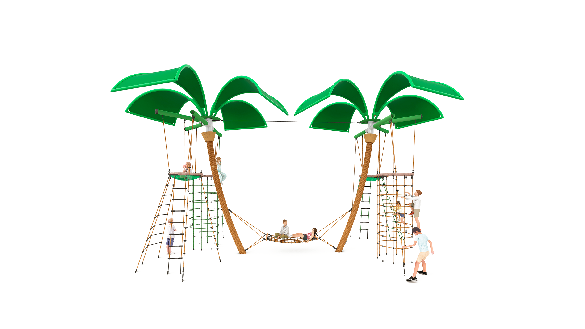 Our new CLIMBING PALM brings holiday and summer flair to the playground: original HUCK honeycomb nests are the destination and can be adventurously climbed over climbing chimneys, ladders and bridges. The large hammock in the middle invites you to relax afterwards.