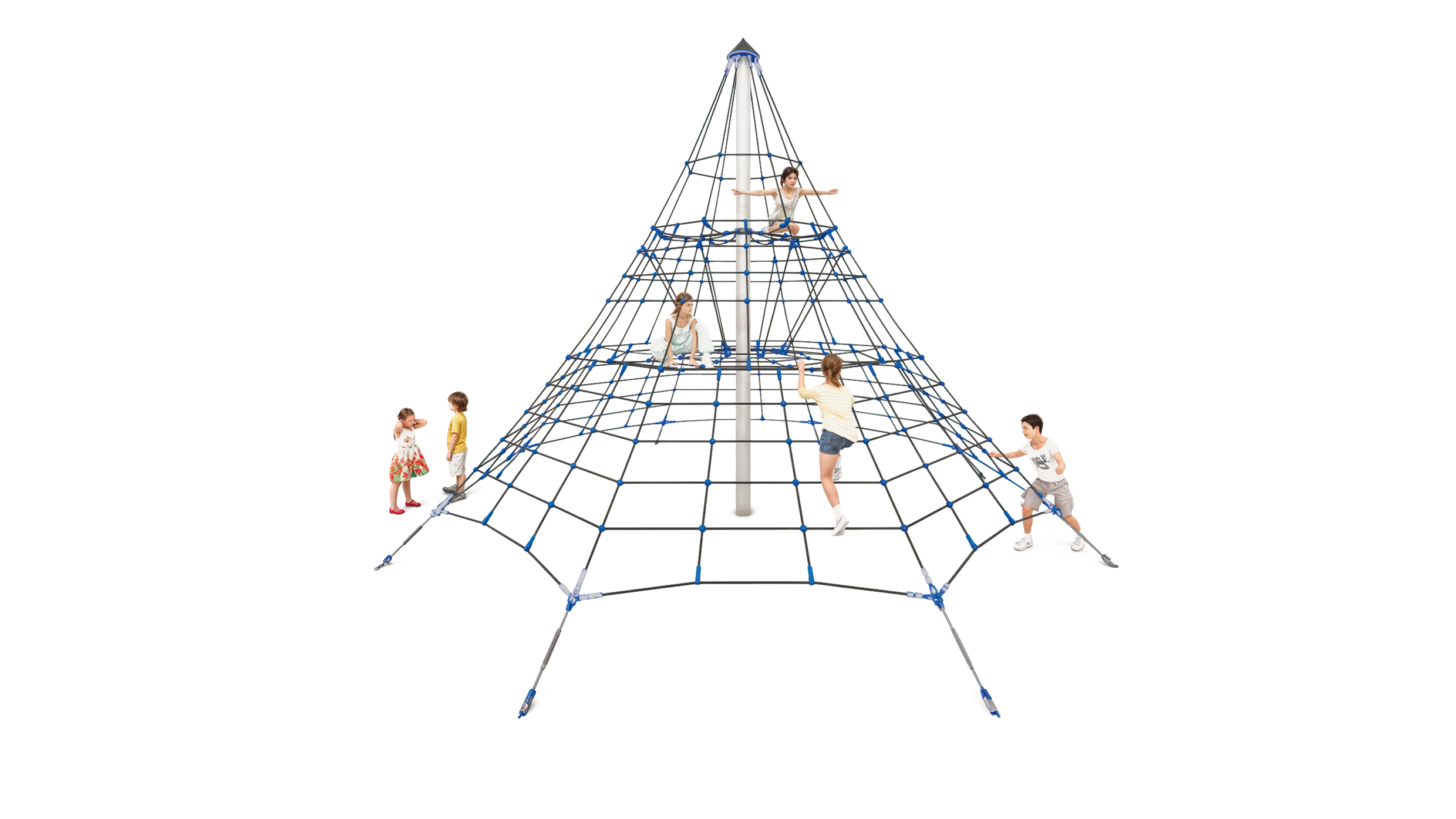 With the Hercules rope in black and the blue plastic connectors, this play equipment makes a big impression. Children can climb to the very top or really let off steam on the net surfaces and horizontal nets.