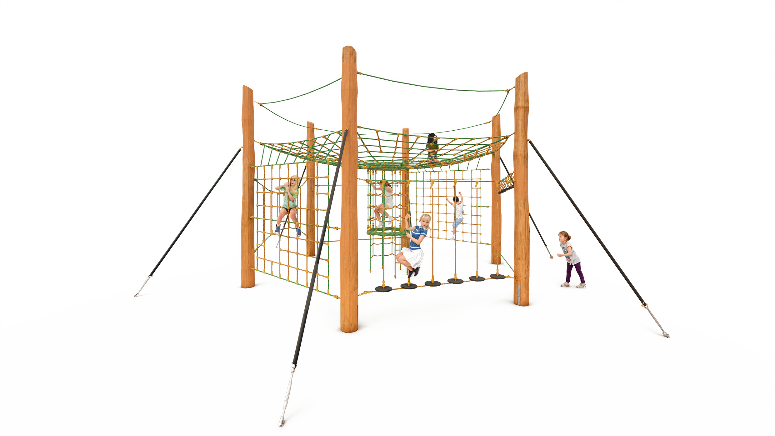 - Netz- und Seilelemente aus Herkulesseil, Seil-Ø ca. 16 mm, 6-litzig, jede einzelne Litze aus einer 2.4 mm verzinkten Stahllitze, mit hochwertiger Polyestergarnummantelung